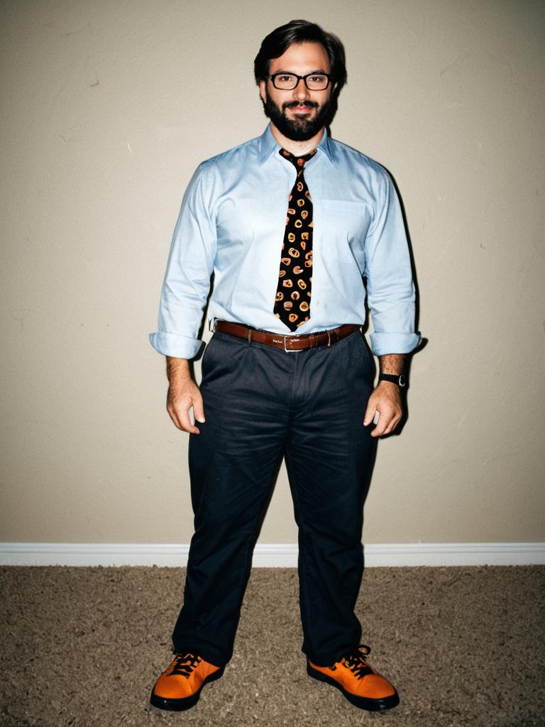Full body portrait of a man with a beard and mustache standing against a plain wall. He is wearing a white shirt with sleeves rolled up, a brown vest, a striped necktie, gray pants, and brown leather shoes. The man has short dark hair and is looking directly at the camera with a confident expression.