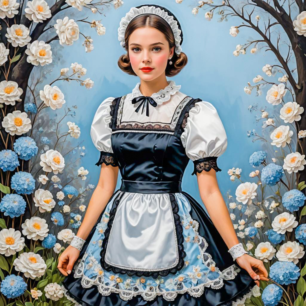 Woman in Classic French Maid Outfit with Floral Backdrop