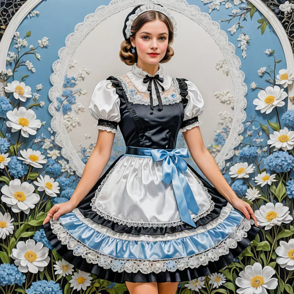 Photo of a woman with fair skin and light brown hair styled in curls, wearing a classic French maid outfit featuring a black and white satin dress with powder blue lace trim, puff sleeves, a fitted bodice, lace apron, and a powder blue satin ribbon tied at the waist. She also wears a lace headband and stands against a vibrant abstract floral mural with white and blue blossoms.