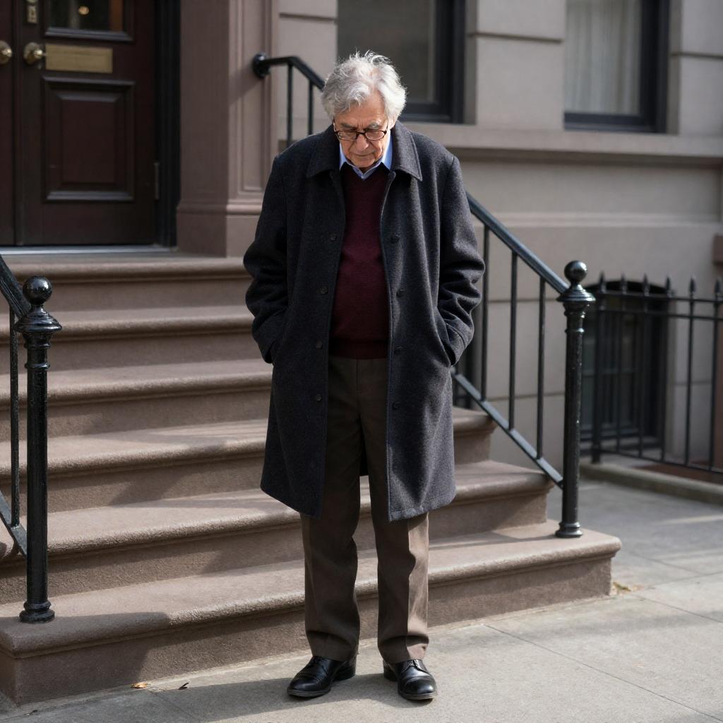 Photograph of an elderly man with gray hair and glasses, wearing a long dark coat, maroon sweater, and brown pants, standing on a city sidewalk. He looks down, hands in pockets, beside concrete steps with black railings and a brown building in the background. Bright daylight casts shadows.