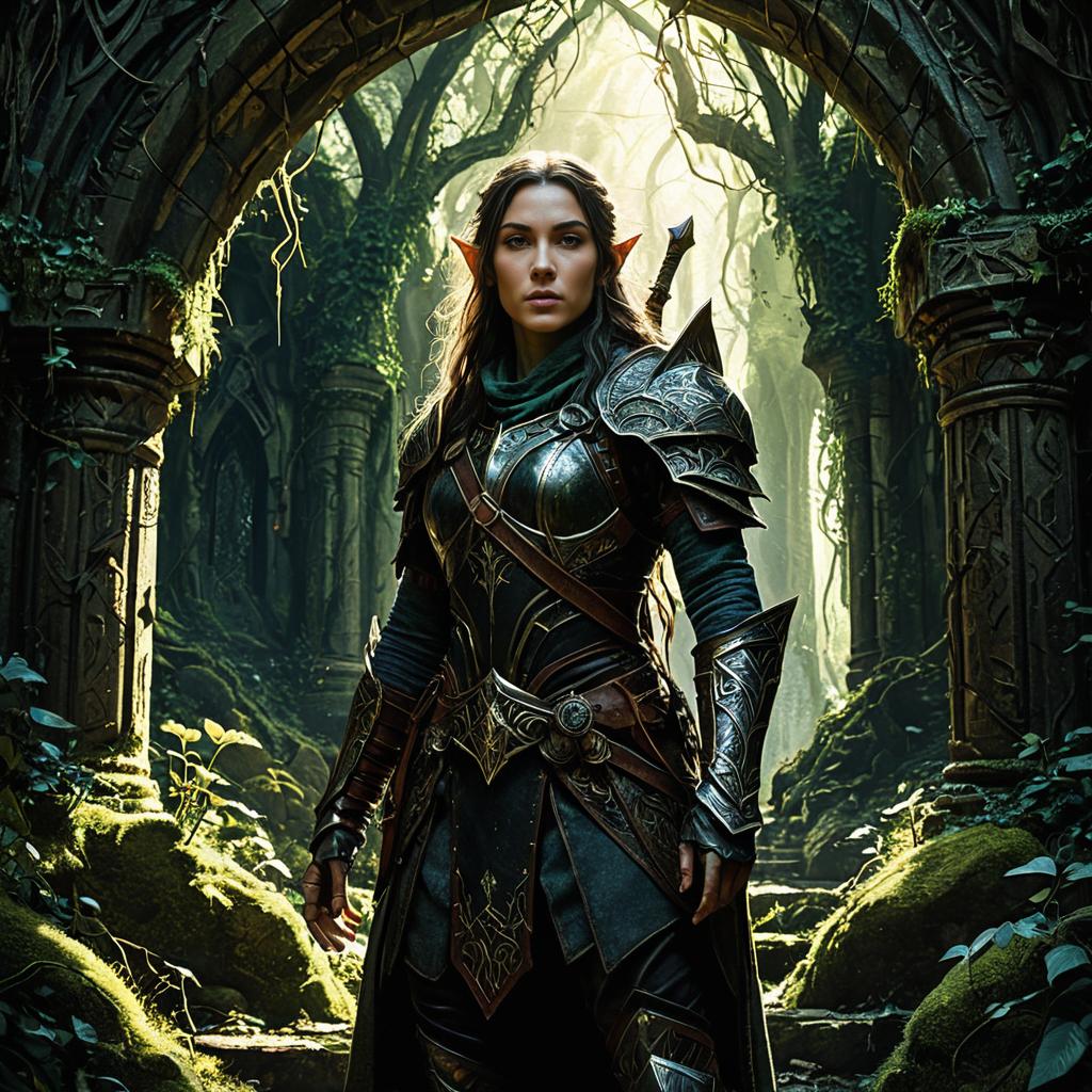 Heroic portrait of elderly mage clad in ancient robes with glowing runes exploring a snowy, enchanted forest at twilight with sparkling frost-covered trees, rendered with dramatic chiaroscuro and moody colors, painterly technique inspired by John Blanche, hyper-detailed cinematic concept art.
