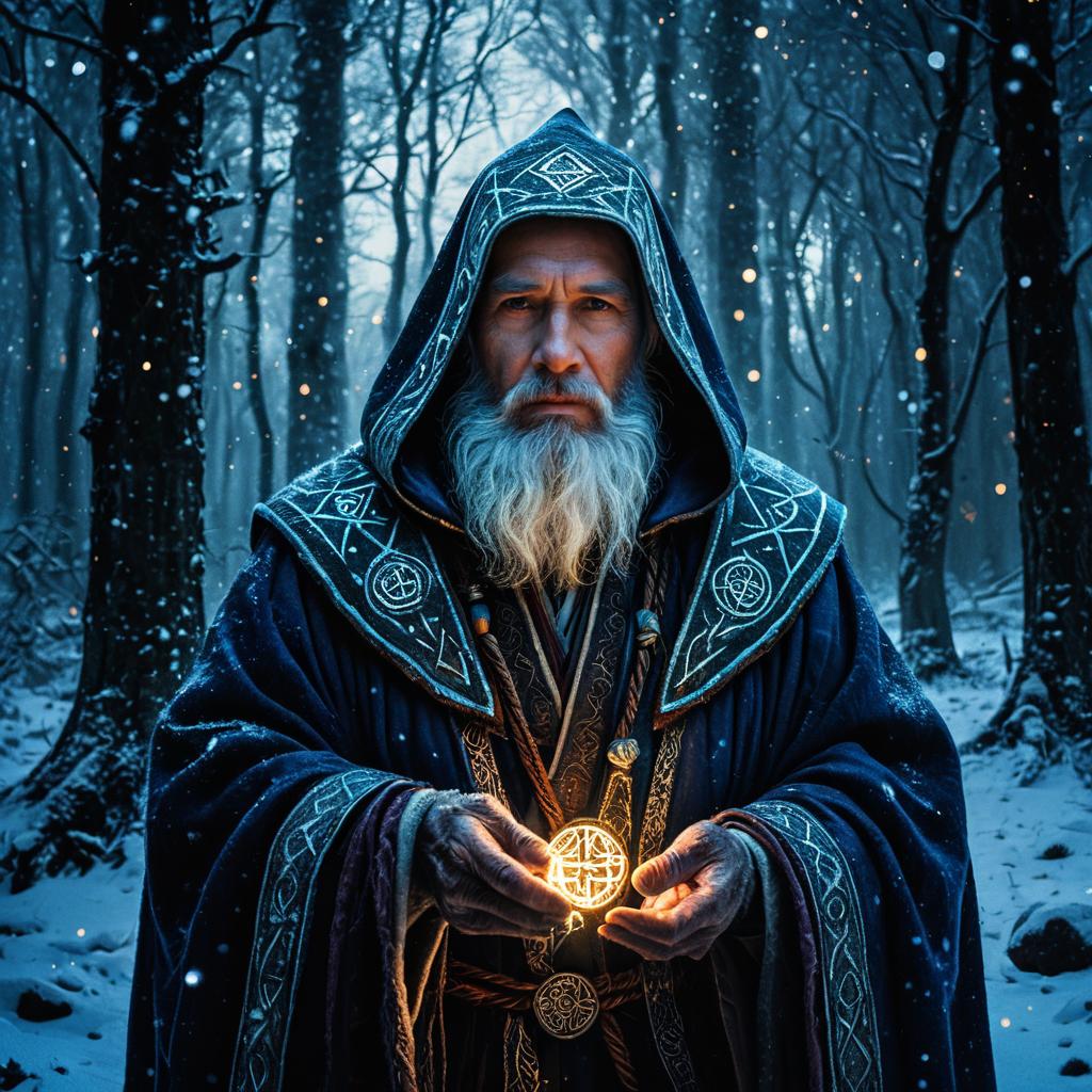 Portrait of an elderly male mage with a long white beard, wearing ancient, dark blue robes embroidered with glowing runes. He stands in a snowy, enchanted forest at twilight, surrounded by frost-covered trees. The mage holds a glowing magical amulet, casting warm light contrasting with the cold, moody blue environment. The scene has a painterly, hyper-detailed cinematic style with dramatic chiaroscuro lighting.