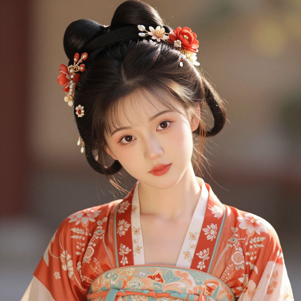 A vibrant digital illustration by Taiwanese illustrator depicting a beautifully adorned young woman in traditional attire, featuring intricate floral hair accessories, a red and white robe with delicate floral patterns, and a serene expression, rendered in a super beautiful hand-painted style with high-definition details and warm, inviting lighting effects.
