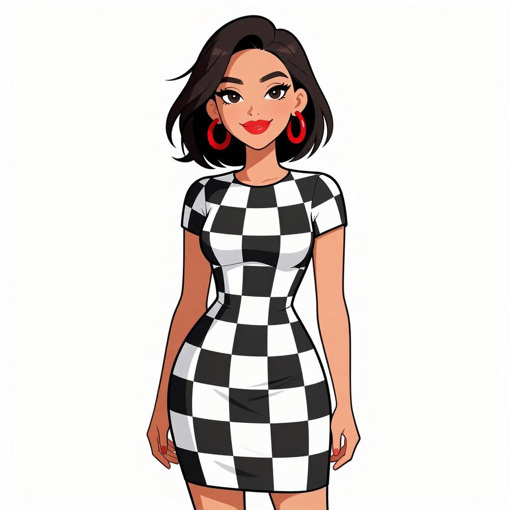 This digital illustration features a smiling woman with short, dark brown hair and fair skin. She wears a tight, black-and-white checkerboard patterned dress that accentuates her curvy figure. Her bright red lipstick and large red hoop earrings stand out. She has bold, dark eyebrows and striking black eyes. The background is plain white, making her the focal point. The style is reminiscent of modern pop art, with sharp lines and vibrant colors. Her confident pose and direct gaze create a sense of boldness and self-assurance.