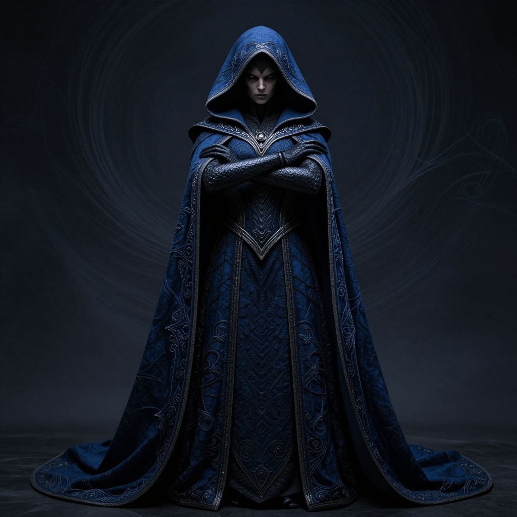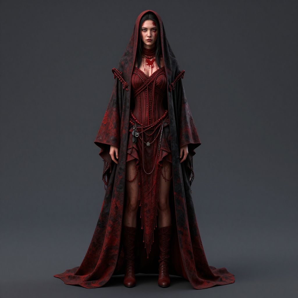 Photograph of a gothic woman with pale skin, dark red hooded cloak, and intricate red dress, standing against a dark blue background, ex