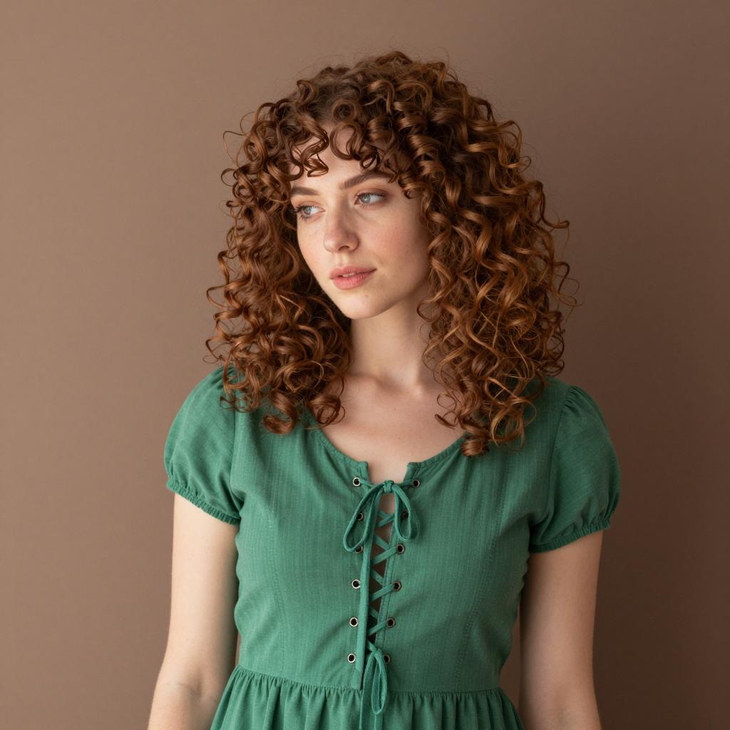Curly brown costume wig, photograph of a young woman with wavy auburn hair, wearing a green, short-sleeved, vintage-style dress with a laced front, standing against a ured brown wall, soft natural light, relaxed pose, subtle makeup, casual and elegant, warm color tones, slight blur in background, realistic style, portrait orientation