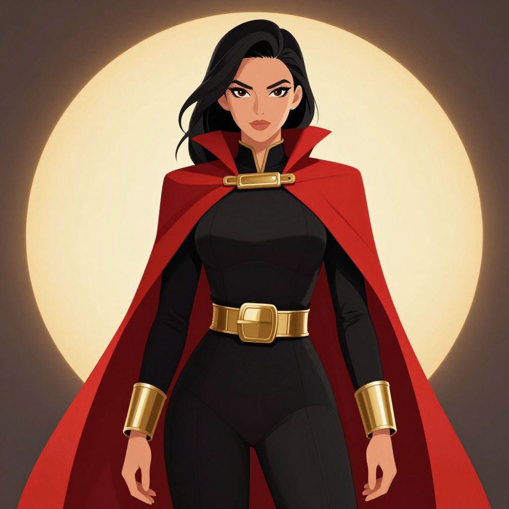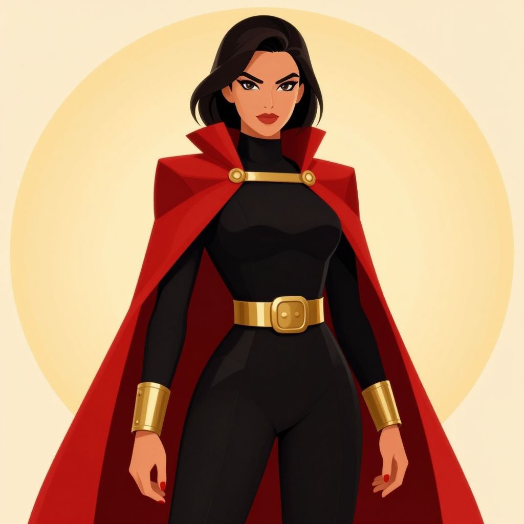 Digital illustration of a confident, dark-haired woman with pale skin, standing against a glowing, circular yellow background. She wears a black form-fitting suit with gold cuffs and a wide, gold-buckled belt. Over her suit, she has a red cape with a high collar. Her expression is determined, with sharp, dark eyebrows and red lips. The style is reminiscent of comic book art, with bold lines and vibrant colors. The overall composition emphasizes her strong, heroic presence.