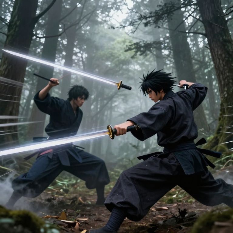 Hokuro Ryuuseigun engaged in a high-speed battle against shadowy figures in a fog-covered forest, with energy blades and dynamic motion lines, blending Japanese martial arts with fantasy elements.