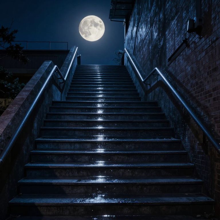 Photograph of a dark, nighttime urban scene featuring a set of wet, glistening stone steps leading upwards. The steps are flanked by metal railings with blue neon lights. A large, bright full moon is centered in the background, illuminating the scene with a bluish hue. The brick walls on either side of the steps add texture, and shadows create a dramatic contrast. The image has a high contrast and vivid color palette, emphasizing the wetness of the steps and the glow of the moon and neon lights.