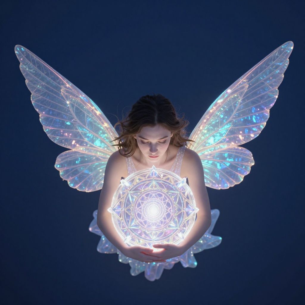 A young woman with luminescent, iridescent wings embraces a levitating, crystalline mandala orb in her arms, set against the backdrop of a deep midnight blue sky. Rendered in a hyper-realistic CGI style, this fantastical portrait emphasizes smooth textures and vibrant colors that glow against the dark background. From an aerial perspective above and behind the subject, viewers are invited to witness her ethereal beauty and spiritual connection with the cosmic object as it emits pulsating waves of energy, evoking feelings of awe, wonder, and transcendence within the observer.