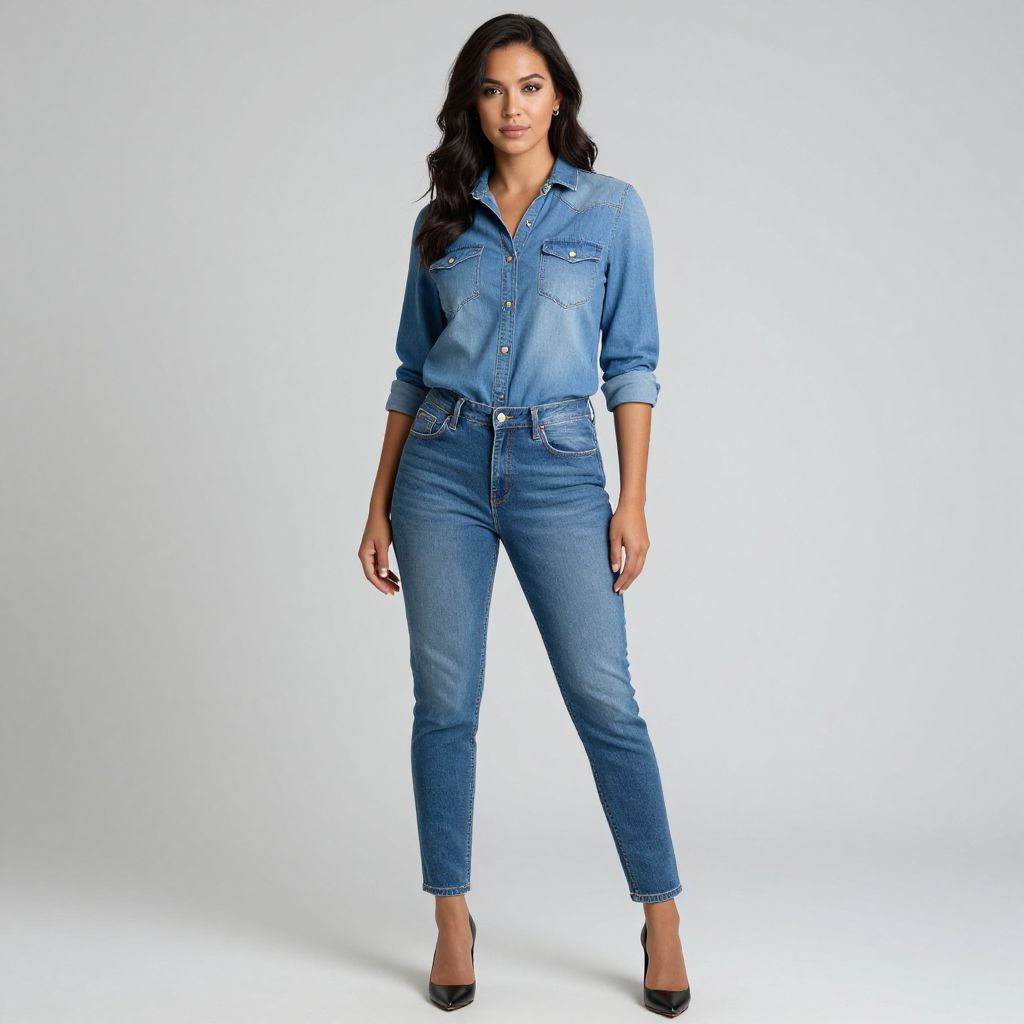 Photograph of a confident woman with long black hair, wearing a blue denim shirt and matching jeans, black heels, standing against a plain white background.