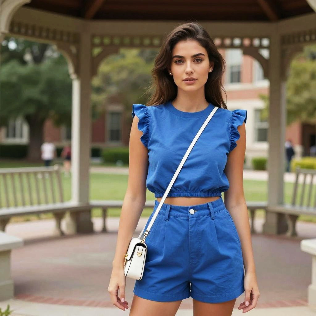 A woman in a contemporary casual outfit featuring a blue sleeveless crop top with ruffle shoulders and matching high-waisted shorts, complemented by a white mini crossbody bag and minimal stud earrings, stands under a gazebo on a university campus, captured in a vibrant, artistic style. Sexy. Pretty face and beutiful eyes