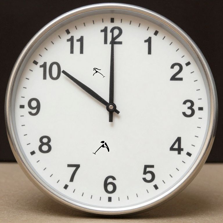 Photograph of a round, white-faced analog clock with black numerals and hands. The clock is set to approximately 10:08, with the minute hand pointing at 8 and the hour hand pointing at 10. The clock has a silver rim and black tick marks for each minute. The background is dark, contrasting with the bright white clock face. The clock is placed on a light-colored, textured surface, possibly a table or desk. The image is sharply focused, highlighting the clock's clean, minimalist design.