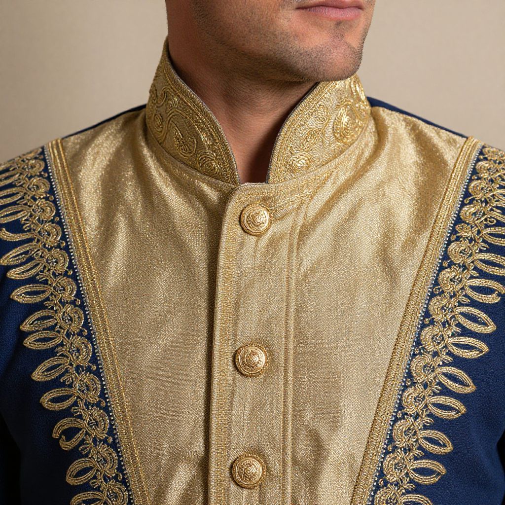 "Trifari Vintage, a close up of a man wearing a blue and gold outfit"
