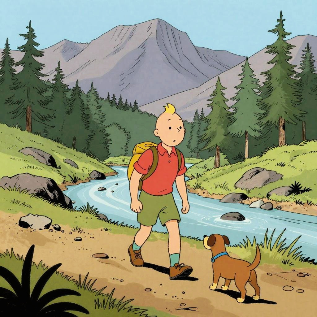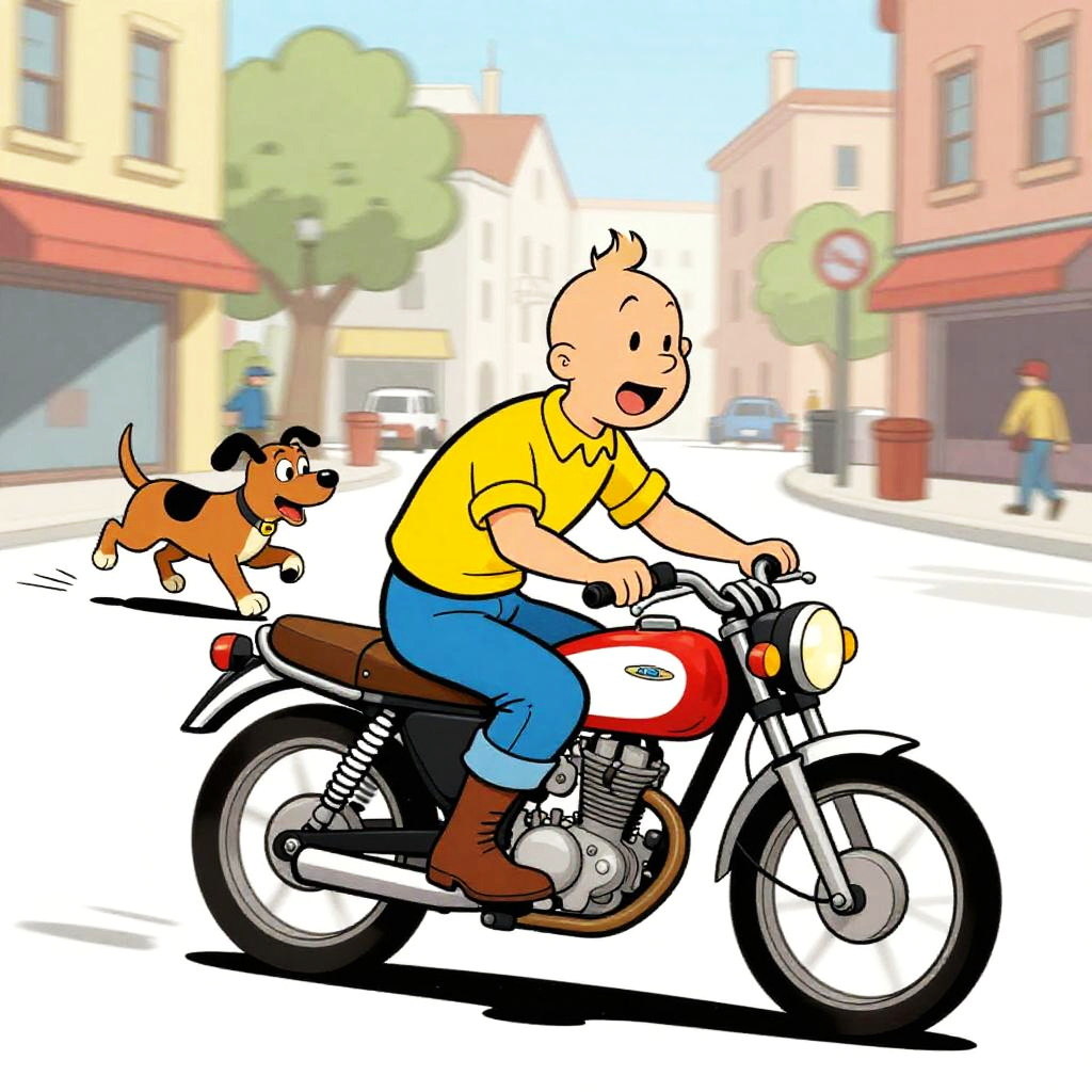 Dynamic Tintin art style action sequence, a boy and his dog escaping peril on a speeding motorbike through a bustling urban street, bold outlines, minimal shading, bright palette, emphasizing heroism and mystery typical of Hergé-inspired illustrations.