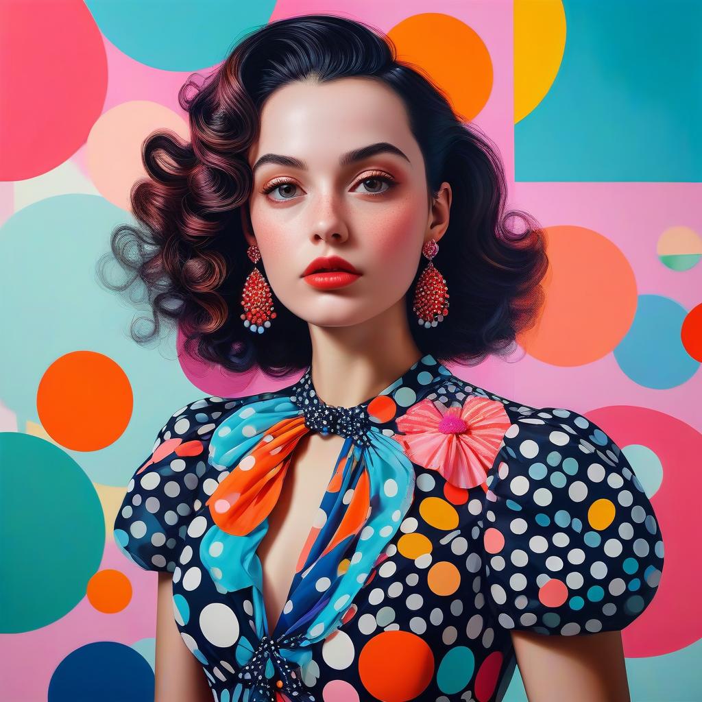 A realistic, glamorous portrait of a woman wearing polka dot maxi dress. The style is inspired by Alex Da Corte, featuring vibrant colors, surreal elements, playful compositions, pop culture references, mixed media aesthetics, whimsical tone, bold textures, and a dreamlike atmosphere. The artwork embraces contemporary art influences with dynamic shapes and an unconventional, expressive approach.