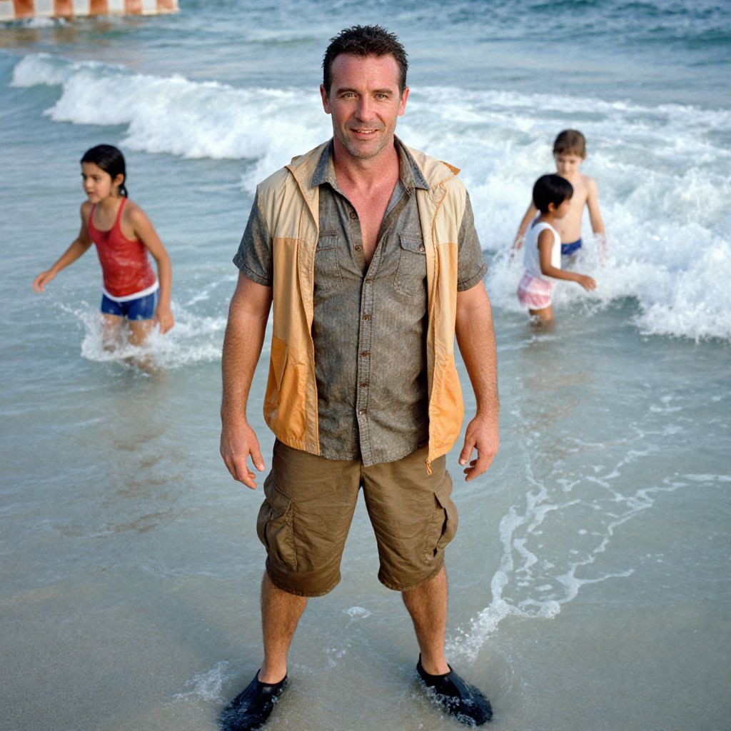 Photograph of a middle-aged white man with short dark hair standing in shallow ocean waves. He is smiling, wearing a wet, beige, sleeveless vest over a gray, short-sleeved button-up shirt and brown knee-length cargo shorts. He has black flip-flops on his feet. In the background, three children are playing in the water: a girl in a red tank top and blue swim trunks, a boy in white swim trunks, and another girl in a pink swimsuit. The ocean is clear with white foam from the waves, and a row of orange and white columns is partially visible in the top left corner.