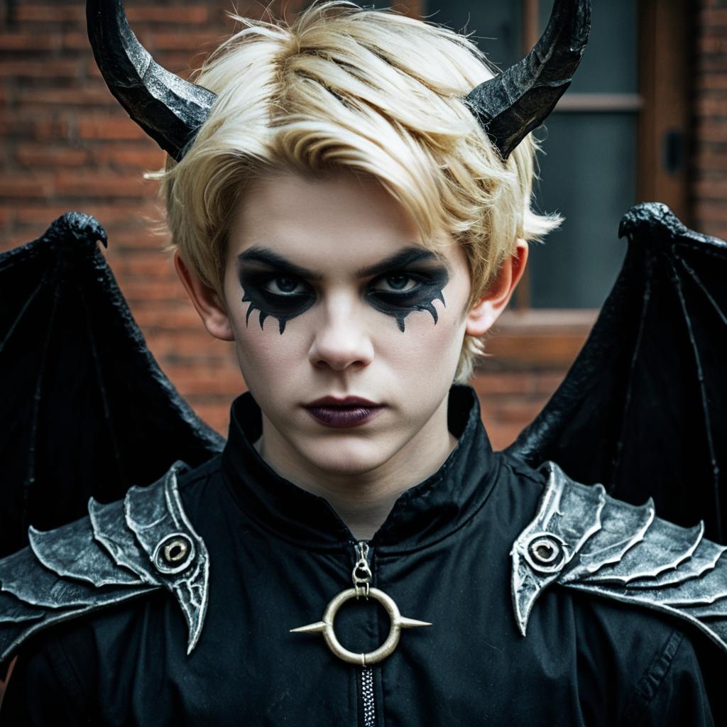Portrait of a young boy with blonde hair dressed in a realistic demon Halloween costume, featuring black demon horns, bat-like wings, dark makeup around the eyes, and dark lipstick. The boy is looking directly at the camera with a serious expression, wearing a black outfit with spiked shoulder armor and a circular pendant necklace.