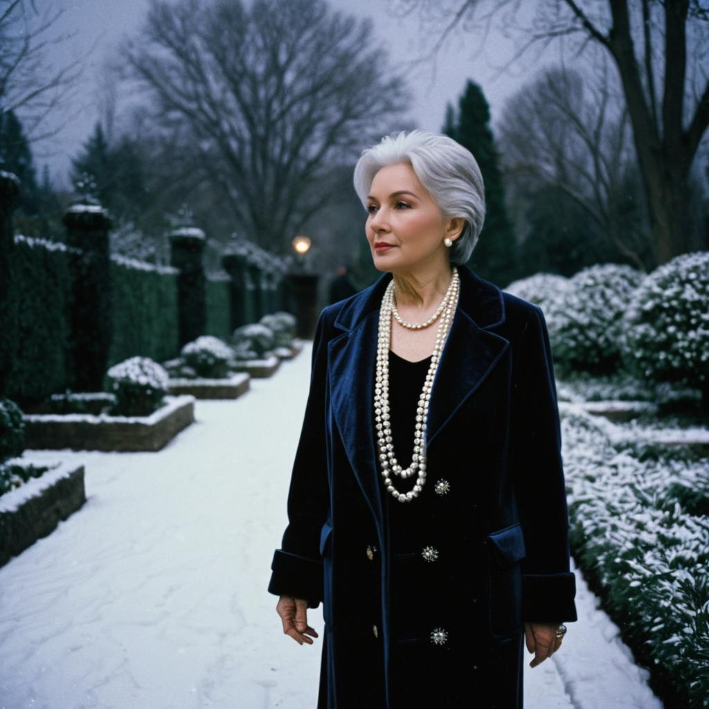 Kodak Portra cinematic film still of a elegant elderly woman with silver hair, wearing a classic pearl necklace and a velvet coat, walking through a snow-covered garden at dusk, moody and atmospheric vibe.