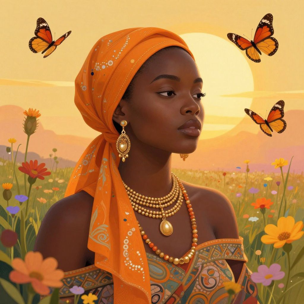 A vibrant contemporary fine art illustration featuring a serene African woman adorned in an orange headscarf and jewelry, surrounded by butterflies and wildflowers under a golden-hued sun, evoking a dreamy and ethereal atmosphere.
