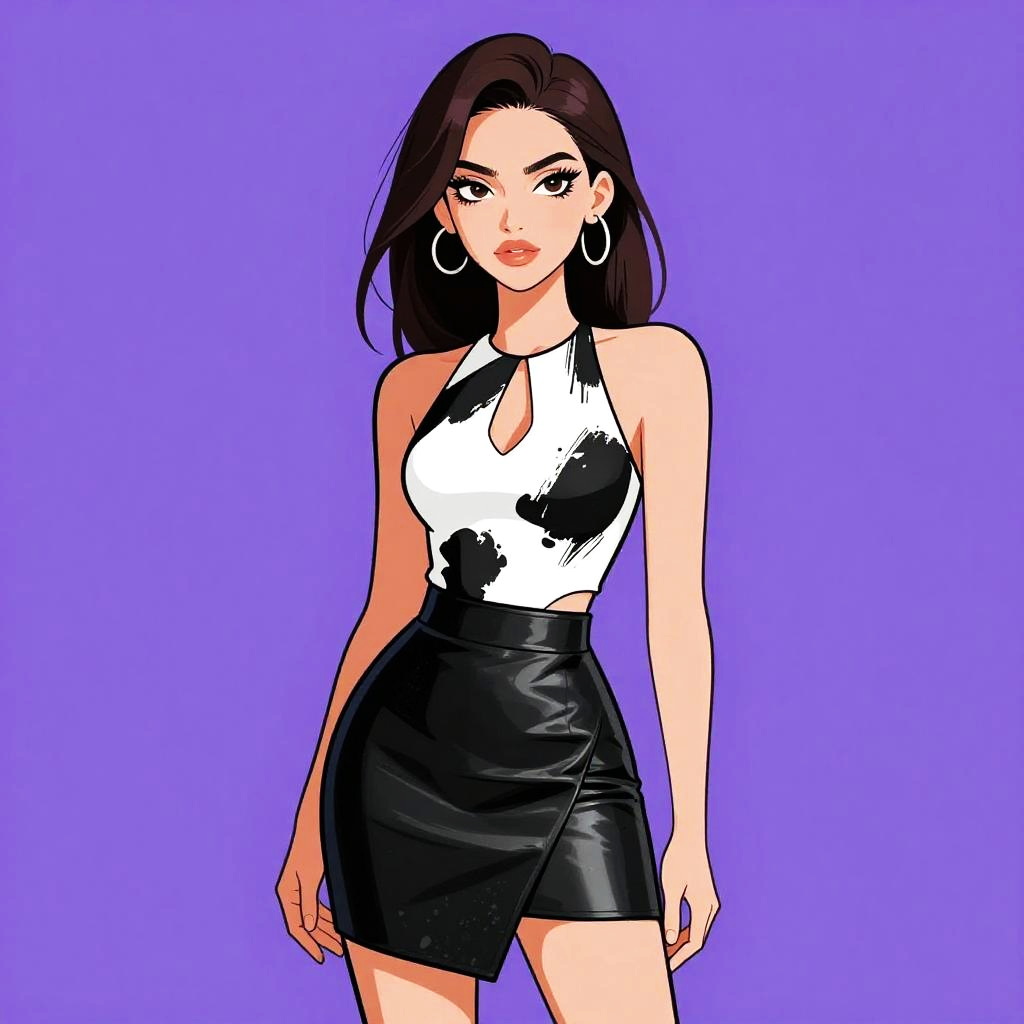 This digital artwork features a confident woman with long, straight dark brown hair and light skin. She has striking, arched eyebrows, large hoop earrings, and full, pink lips. She wears a sleeveless, white halter top with black splatter patterns and a high-waisted, black leather mini skirt. The background is a solid, vibrant purple. The style is reminiscent of contemporary comic art with bold lines and bright colors. Her pose is relaxed yet assertive, with her left arm slightly bent and her right arm hanging by her side.