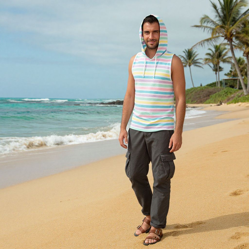 A man, striped hooded tank in pastel colors, dark gray cargo pants, brown leather sandals, golden sands, turquoise waves, swaying palm trees, 3M ferrania analog film stock, relaxed smile, carefree vibe. Man has masculine face and piercing eyes