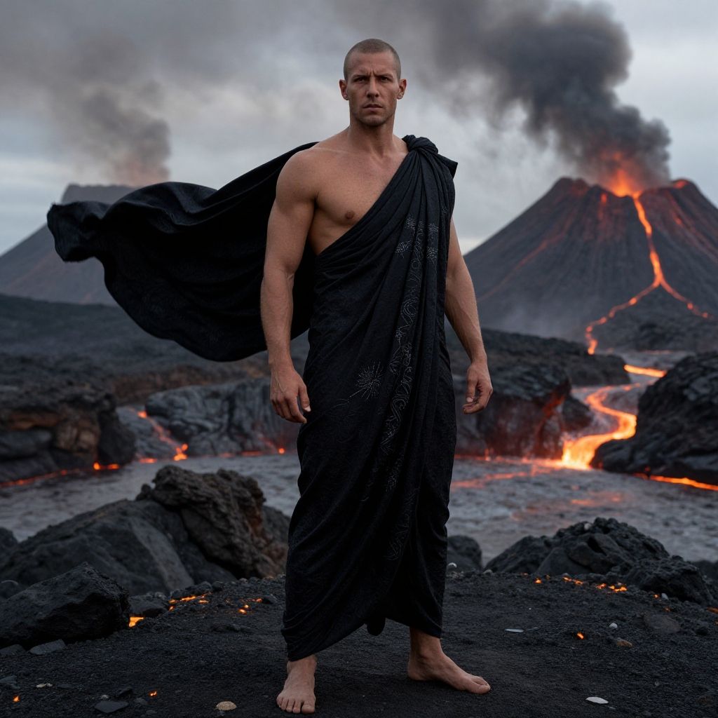 Photograph of a bald, muscular man in a black, one-shoulder toga standing on volcanic rocks with erupting volcanoes and lava flows