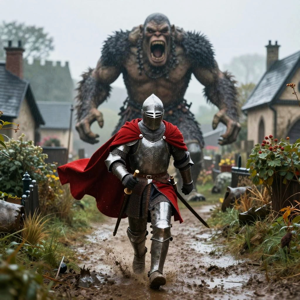 Brave Knight Fleeing Ogre in Rain