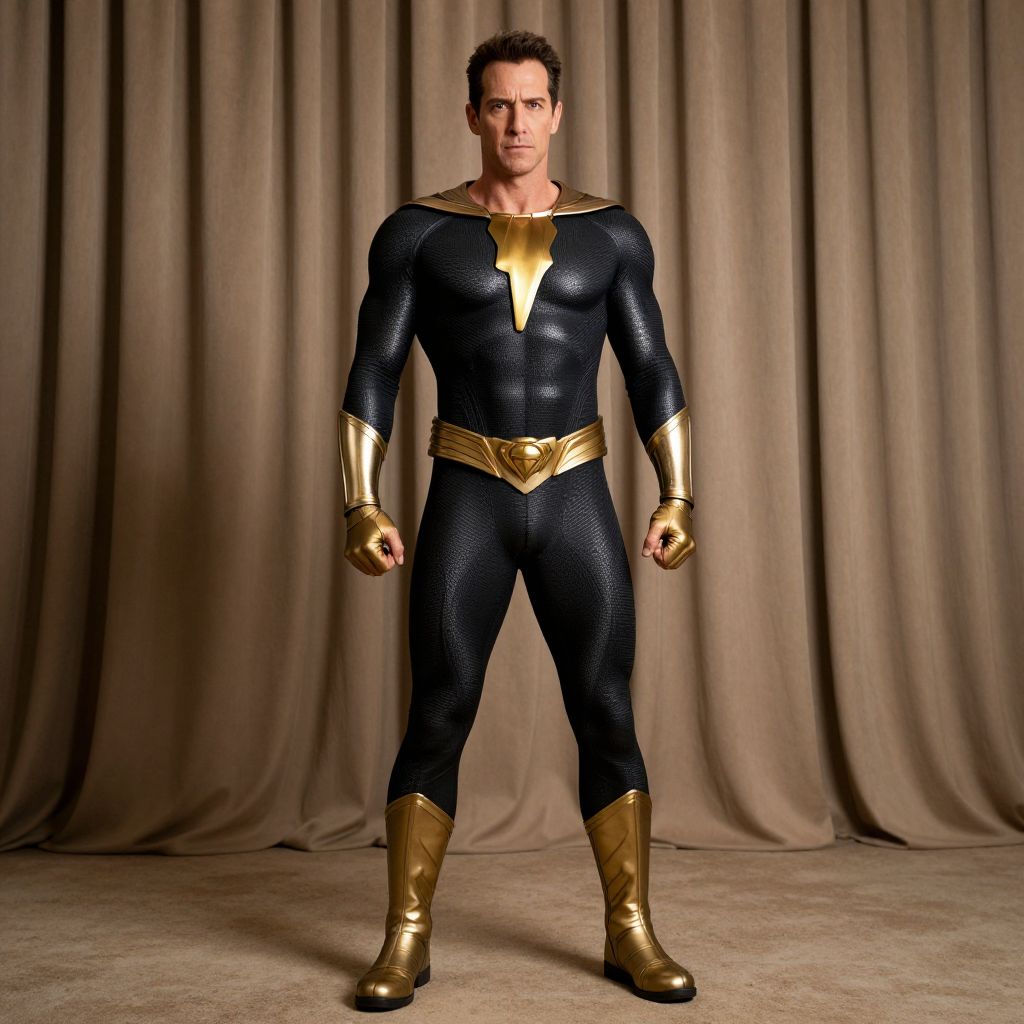Photograph of a muscular man in a black, textured superhero suit with gold accents, standing against beige curtains.