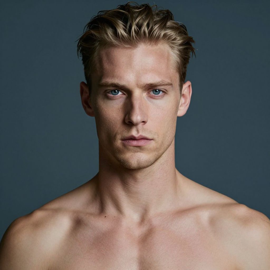 Photograph of a shirtless, fair-skinned, blue-eyed man with short, tousled blonde hair and a chiseled jawline. He has a serious expression, with subtle shadows highlighting his muscular shoulders and collarbones. The background is a solid, dark blue, which contrasts with his light complexion. His hair is slightly wet-looking, adding texture. The lighting is even, emphasizing his facial features and upper body. The image has a realistic, high-definition style, focusing on the subject's natural beauty and physical strength.