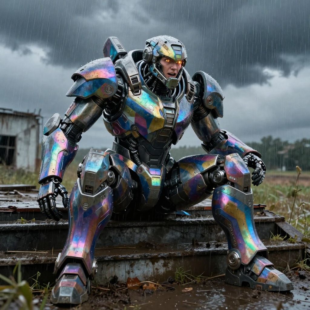 Photorealistic digital artwork of a muscular, rainbow-hued, armored cyborg warrior sitting on a rain-soaked, abandoned railway track under a storm