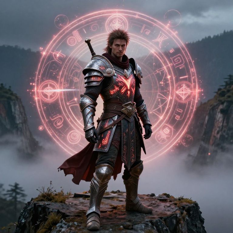 Photograph-like CGI image of a muscular, bearded man in detailed, silver medieval armor with red glowing runes on the chest plate. He stands confidently on a rocky outcrop, surrounded by misty mountains and dense forest. Behind him, a large, glowing pink magical circle with runes and symbols floats, casting an ethereal light. His dark red cape flows behind him, and his left hand rests on the hilt of a sword sheathed at his back. The sky is overcast, adding a dramatic, mystical atmosphere to the scene.