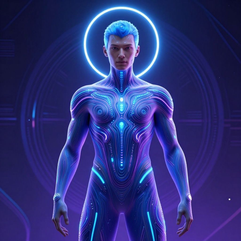 This stunning digital artwork features a futuristic male figure adorned with intricate blue and purple patterns. The glowing halo and detailed background contribute to a mesmerizing sci-fi aesthetic, inviting viewers into a vivid, otherworldly experience.