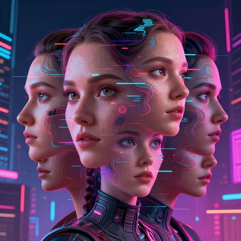 Digital artwork featuring a CGI-rendered woman with three overlapping profiles, each with distinct expressions. Her skin is smooth, her brown hair is slicked back, and her blue eyes are wide. Neon pink, blue, and purple lines and patterns overlay her faces, adding a futuristic, cybernetic feel. She wears a high-collared, black, synthetic garment. The background is a dark, neon-lit cityscape with colorful, vertical lights. The overall style is cyberpunk, blending realistic textures with vibrant, digital aesthetics. The image conveys a sense of multiple identities or a futuristic, high-tech persona.