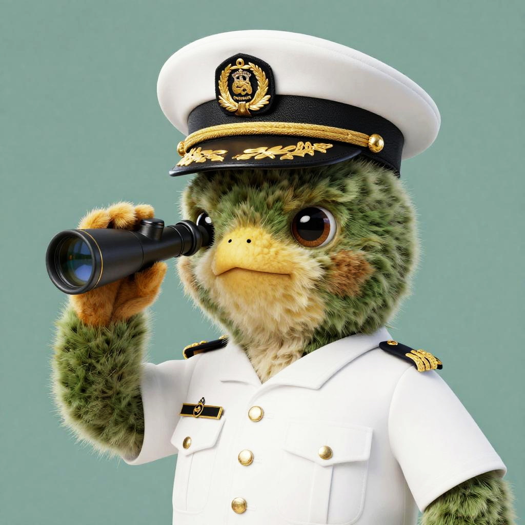 Anthropomorphic platypus depicted as a president, wearing naval uniform with captain’s hat, with a spyglass in hand and a determined view.