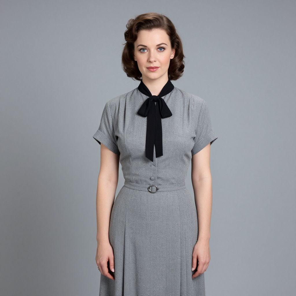 1950s British Woman Fashion, woman in a gray dress and black collared shirt