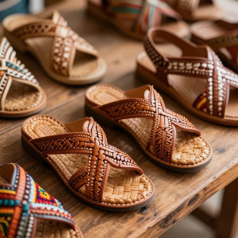 Close-up of traditional Mexican huarache sandals displayed on a rustic wooden table. The sandals feature intricate leather patterns and woven soles, showcasing artisanal craftsmanship with warm natural lighting highlighting the texture and vibrant color accents.