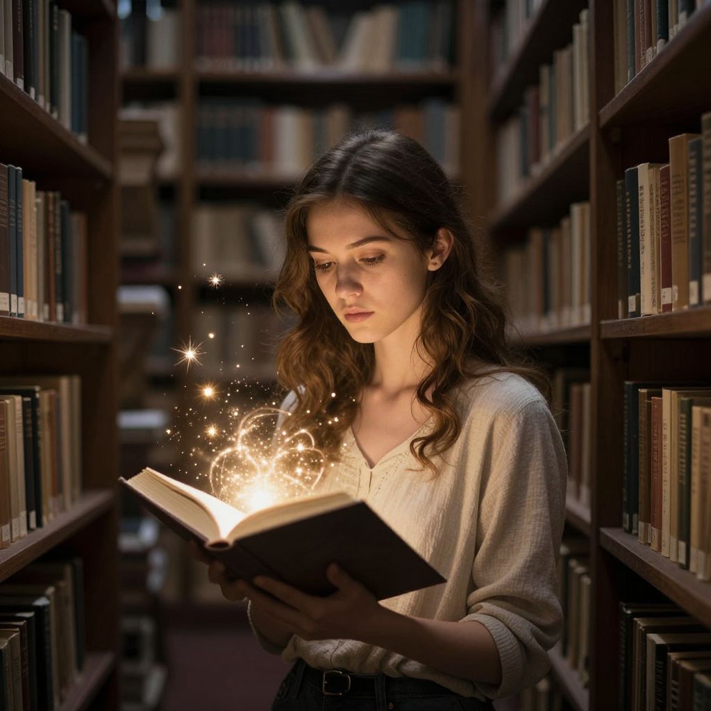 Photograph of a young woman with long brown hair, wearing a white blouse, reading a book in a library, with magical sparks surrounding the open book