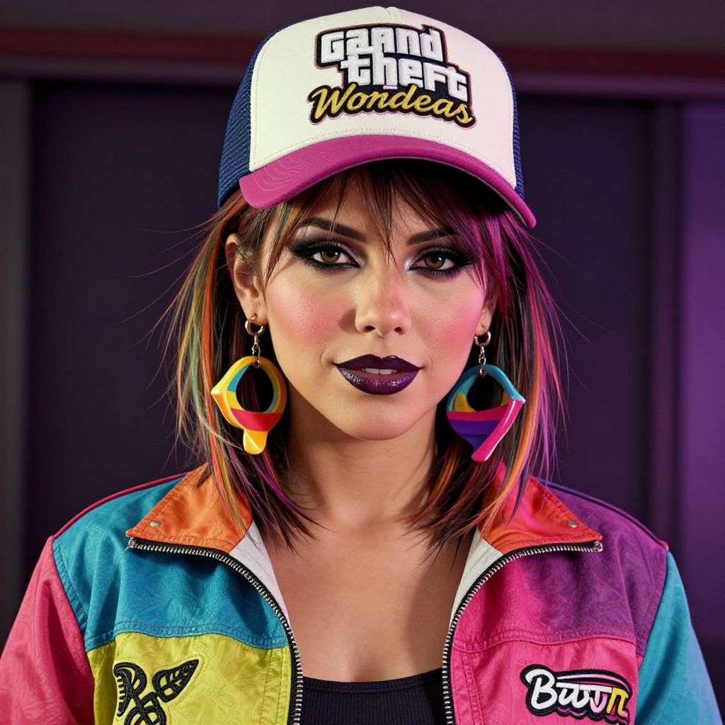"Grand Theft Auto: San Andreas" (the videogame) style.Portrait of "Levy Tran". In "Los Santos" aesthetic. Medium-short hair, multi-colored hair, elegant-messy hair.Big multi-colored random-shaped earrings.Seductive eyesight.Lips sensually parted.Blushing.Subtle smiling.Stares the viewer.Heavy smokey multi-colored makeup and lined glossy multi-colored lipstick.She is wearing multi-colored "Badass Woman" outfit.Hat, lips, earrings and eyes are different colors.Backward multi-colored baseball hat.Overwhelmingly masculine.By "Simon Stalenhag".Life-like details.Cinematic. Dramatic. Dynamic. Extremely refined lines and and shapes.Extremely refined details on objects.Sharp details.Wide range of colors.Many details everywhere. Ray-Tracing. Anti-Aliasing. Realistic soft shadows. Low saturation colors. Insane quality. Insane resolution. Insane details. Masterpiece. 32k resolution.