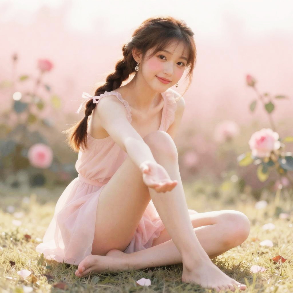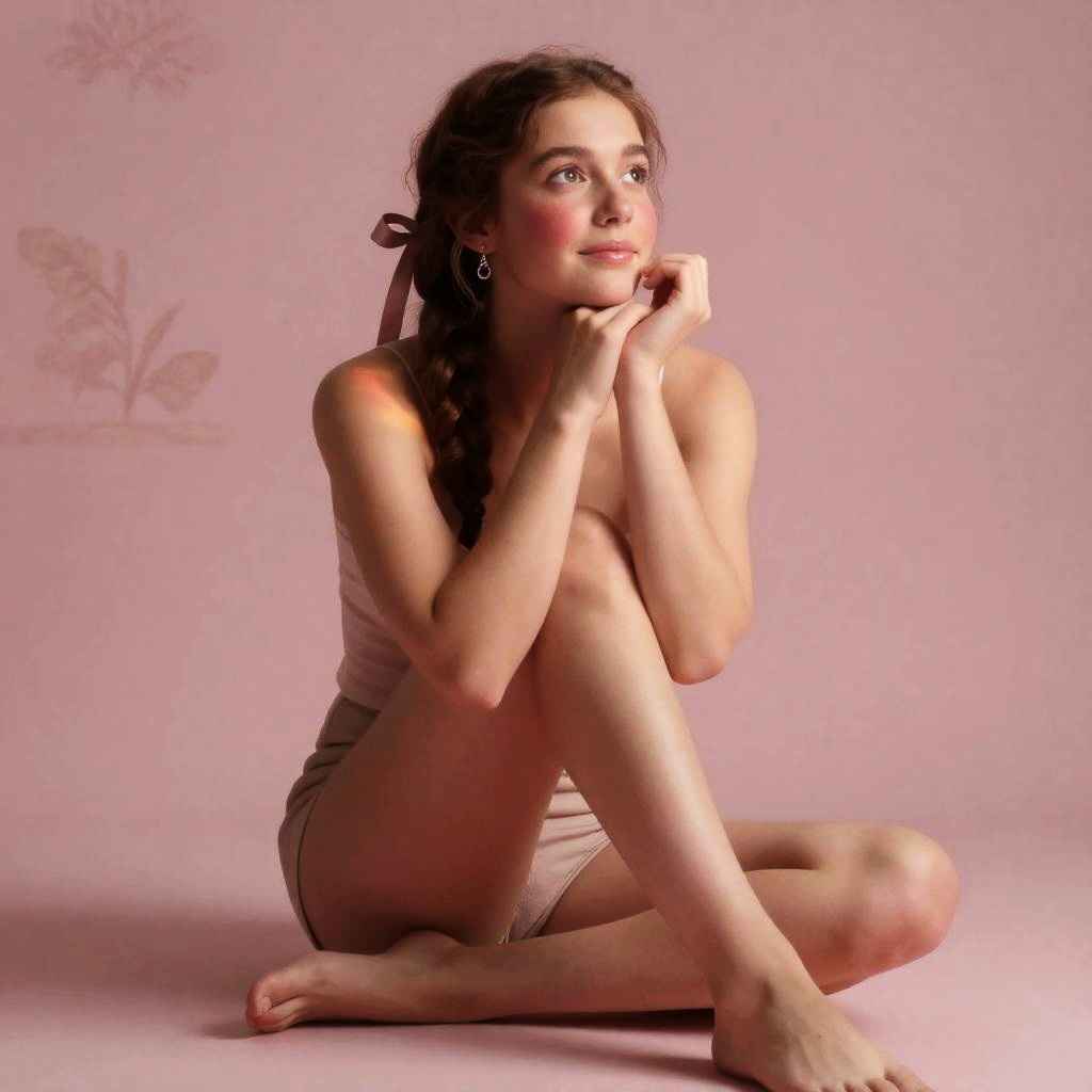 Aerith gainsborough, 1girl, sitting, long brown hair, braid, hair ribbon, blush, earrings, jewelry, pink background, toned, barefoot, arm support, peaceful, delicate hair tuck behind ear while gazing downward, soft morning backlight with warm rim glow, delicate cherry blossom petals drifting