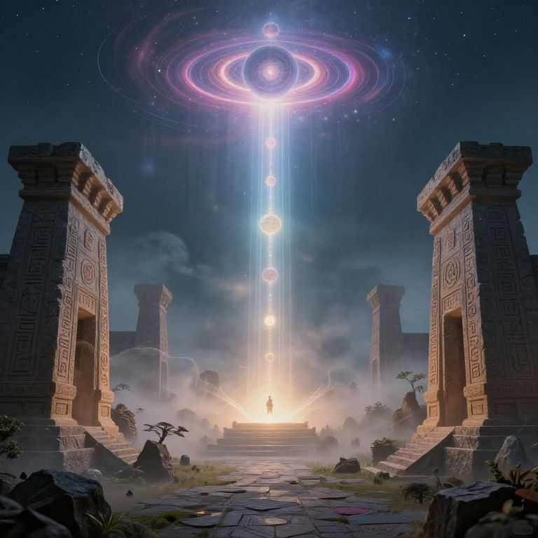 Hermeticism inspired surreal landscape, fusion of the material and spiritual realms, ancient temples with esoteric symbols carved in stone, ascending light beams piercing through mist, celestial bodies aligned overhead, dreamlike and mysterious atmosphere with ethereal colors