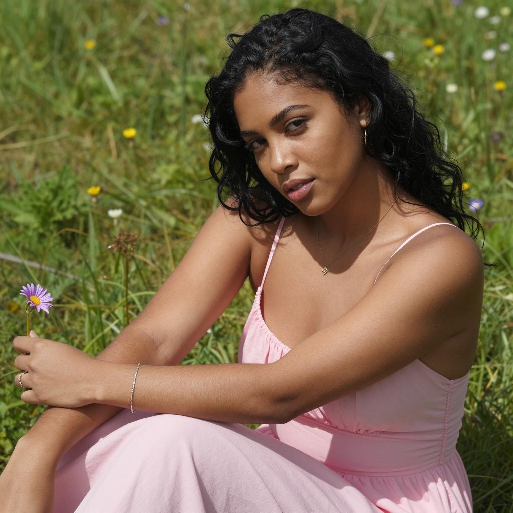 Black-and-white photograph of a woman with dark curly hair, sitting on hay. She wears a lace, off-the-shoulder top, earrings, and bracelets. Her head rests on her hand, legs crossed. She gazes at the camera with a relaxed expression. Her bare shoulders and upper chest are visible. The hay forms a ured background.