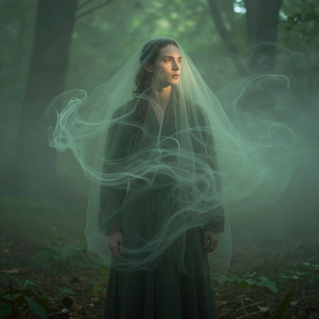 Photograph of a young woman standing in a misty forest. She has fair skin and long, wavy brown hair, partially covered by a translucent, ethereal veil that billows around her. She wears a dark, long-sleeved dress that blends into the shadowy background. The light filters through the trees, casting a greenish-blue glow on her face, which looks serious and contemplative. The misty atmosphere and the delicate, swirling veil create a magical, otherworldly effect. The forest background is dense with tall trees, and the ground is covered with leaves and underbrush. The overall mood is mysterious and enchanting.