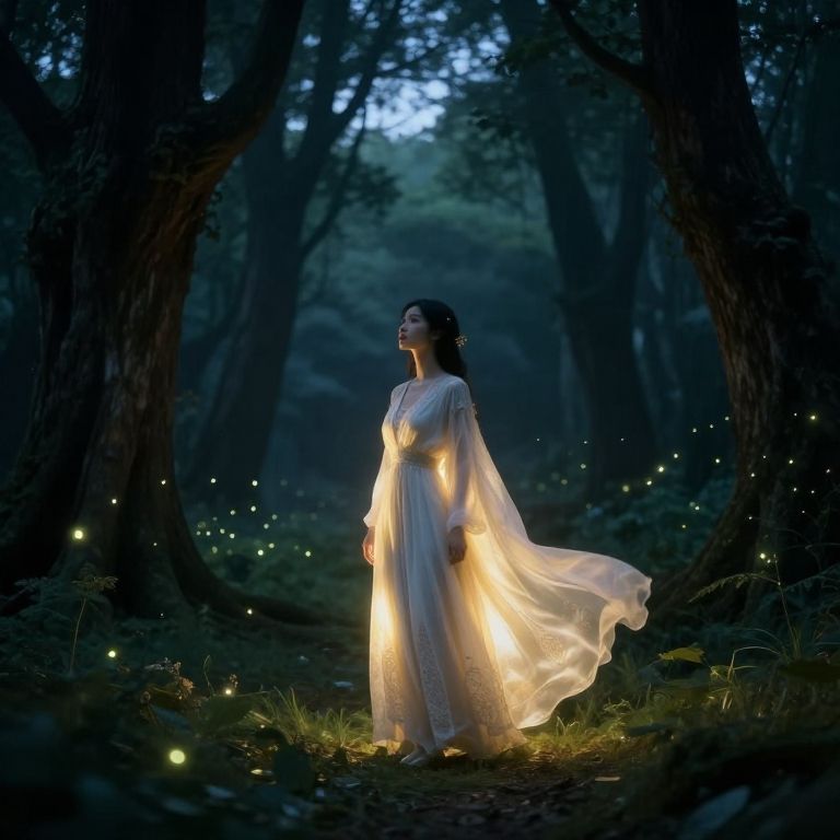 Photograph of a woman in a dark forest, wearing a flowing, translucent veil that swirls around her, illuminated by soft green light. Ethereal