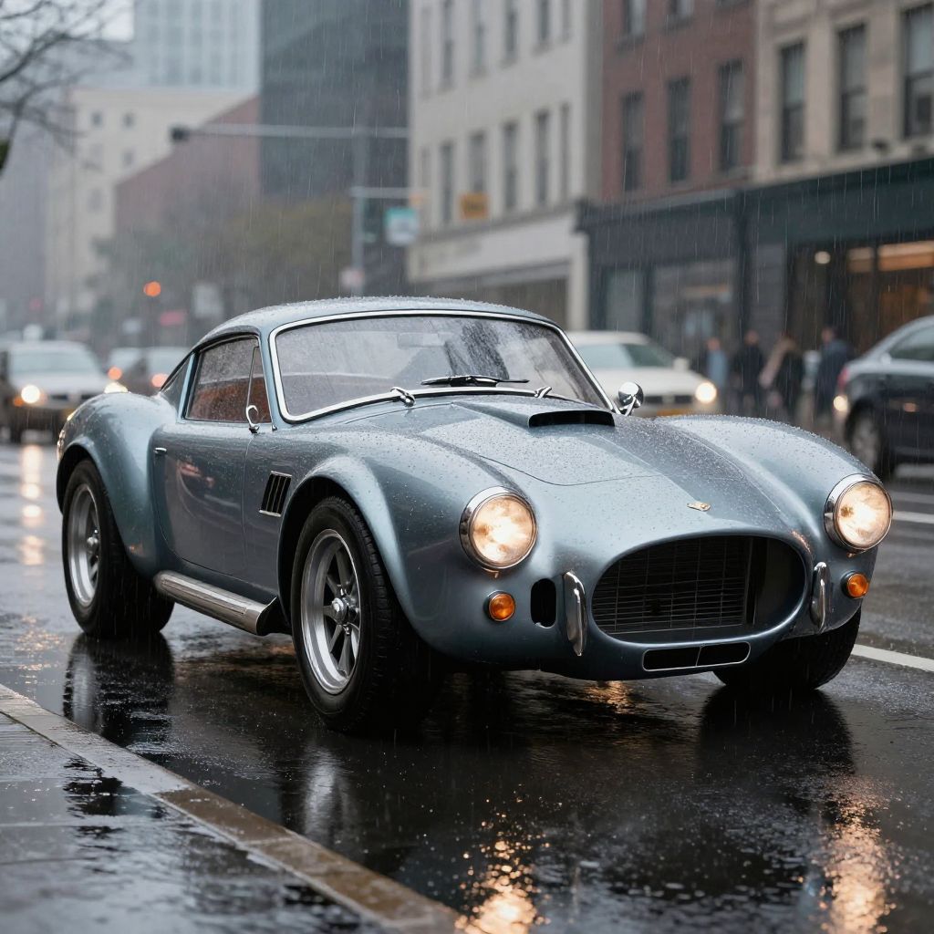 Photograph of a sleek, silver, classic 1960s sports car driving on a wet, rainy city street. The car's headlights are on, reflecting off the slick, rain-splattered road. The car features a prominent hood scoop, a large black grille, and chrome accents. In the background, blurry city buildings with various storefronts line the street, and a few other cars with headlights on are visible. The wet pavement and overcast sky create a reflective, atmospheric effect, enhancing the car's shiny surface and the overall urban, rainy-day setting.