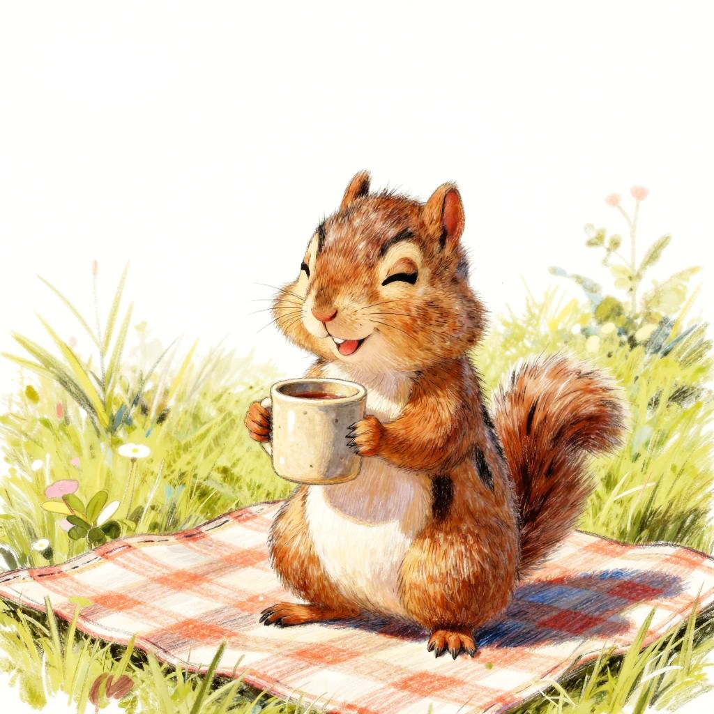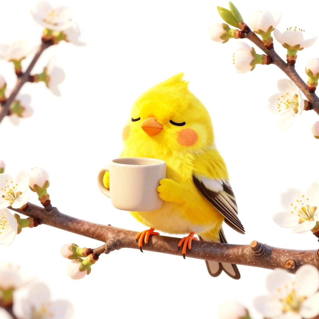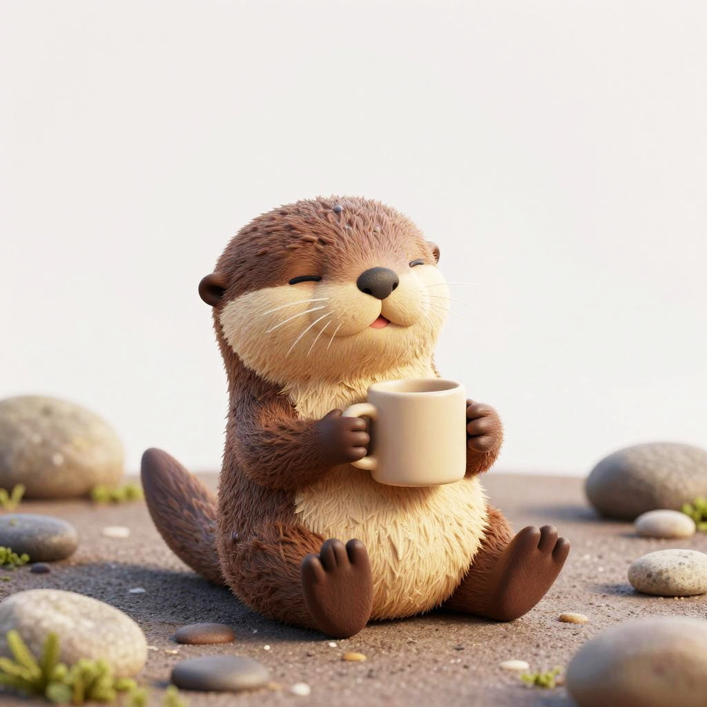 Vibrant acrylic painting of a chubby white rabbit with shiny pink nose, eyes closed and smiling, holding a beige mug with both paws. plain white backdrop framed with clean negative space so the character is the focal point. Soft textures, friendly whimsical vibe, centered composition, gentle rim light, subtle shadows, high detail, minimal clutter, inviting color palette.