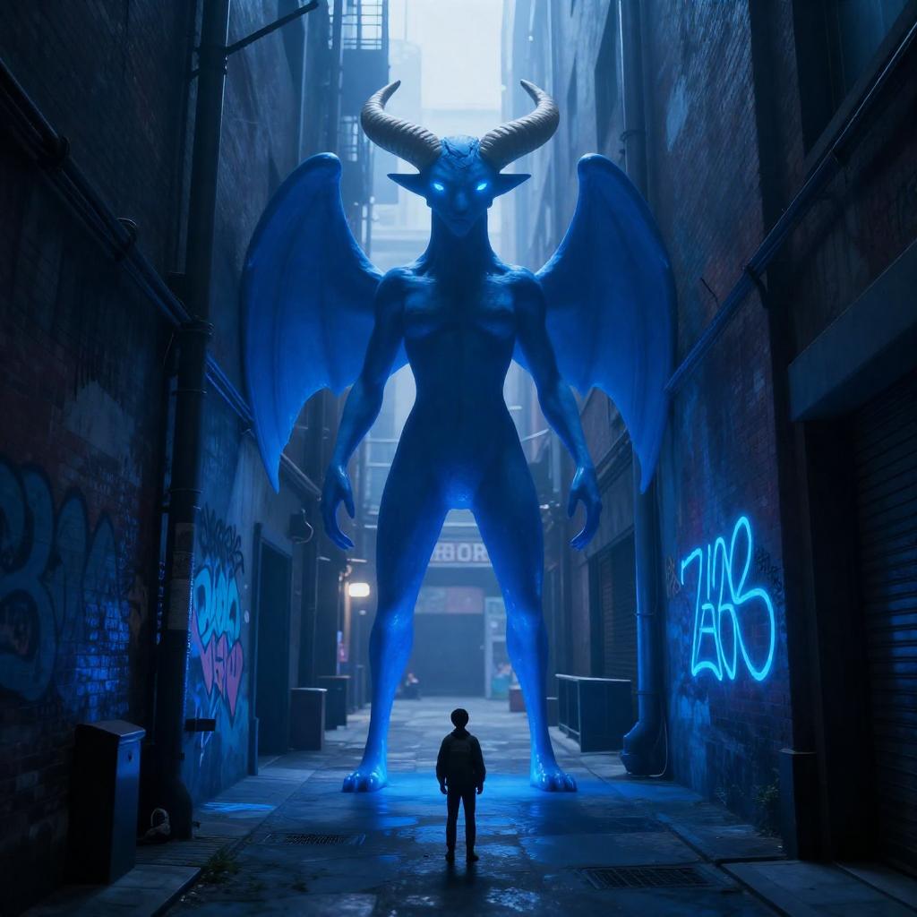 Digital artwork of a narrow, dimly-lit urban alleyway. Tall, glowing blue creature with large horns and wings stands in the center. Small human figure in front, looking up. Neon blue graffiti on walls. Bright light at end of alley.