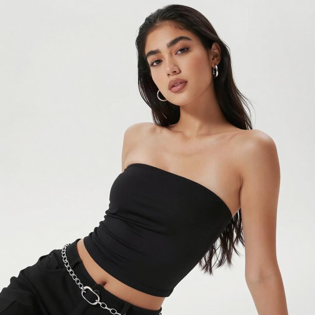 Photograph of a woman with long black hair, wearing black sunglasses, a black crop top with lace-up front, and black arm sleeves with leather straps. She stands against a ured white wall, her right arm raised, showcasing her confident pose. She has gold hoop earrings and a tan complexion.