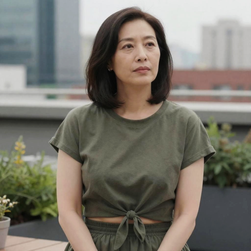 Vivacious young artist wearing a vibrant red cropped top tied at the front, sitting in an artsy rooftop terrace