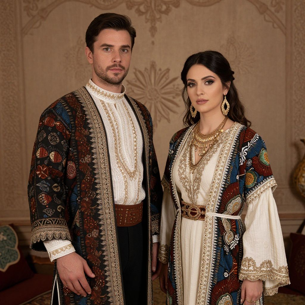 Photograph of a Caucasian couple standing in an ornately decorated room. The man, with dark hair and a beard, wears a black embroidered robe over a white, high-collared shirt and brown belt. The woman, with long dark hair, wears a white embroidered dress with a blue and red patterned shawl, gold jewelry, and a brown belt. Both have serious expressions. The background features beige, patterned wallpaper and a cushioned bench with decorative pillows. The lighting is warm, highlighting the intricate details of their traditional, Middle Eastern-inspired clothing.
